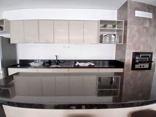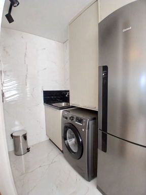 Cozinha planejada e equipada, integrada à área de serviço (com máquina de lavar)