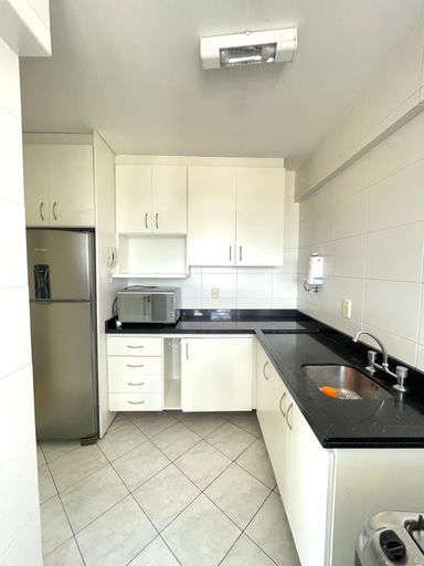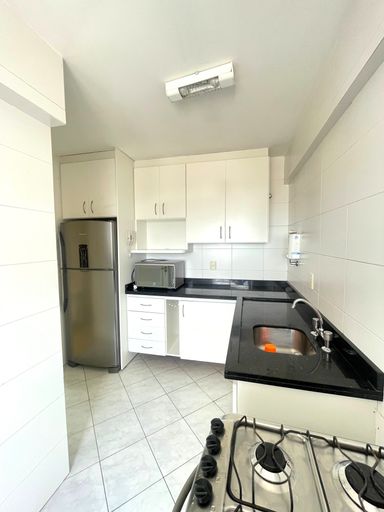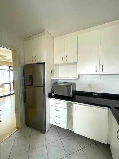 - Cozinha planejada com armários, equipada com geladeira, fogão e micro-ondas