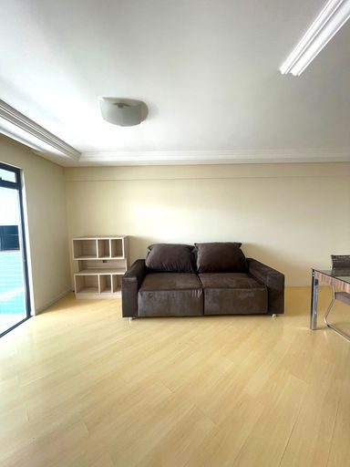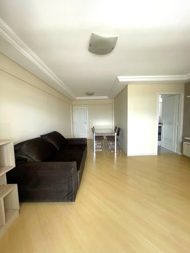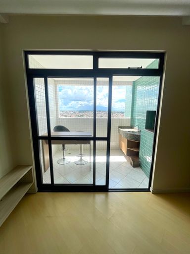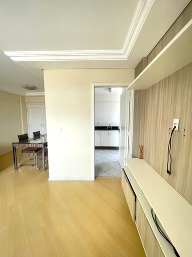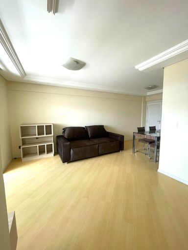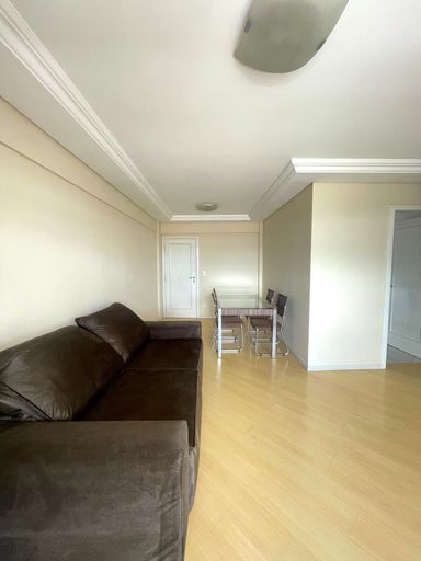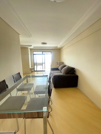 - Sala ampla conjugada com copa, mobiliada com mesa de 4 cadeiras, rack e sofá