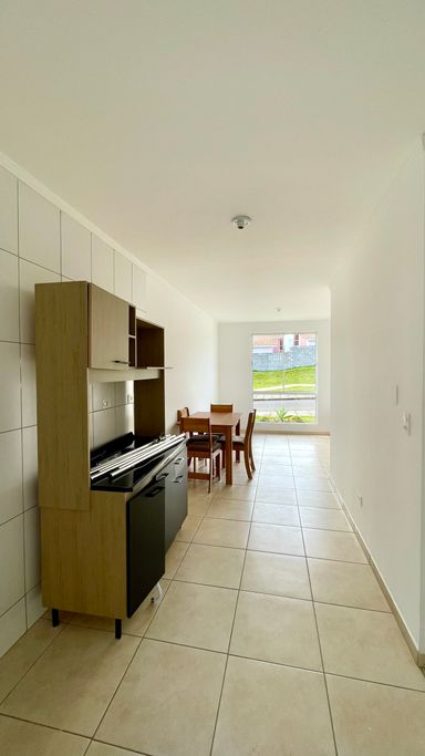 Casa com 02 dormitórios, sala de estar e jantar, cozinha com armários, banheiro social, área de serviço e garagem.