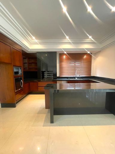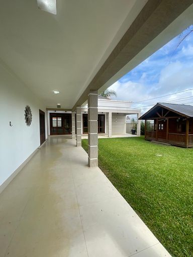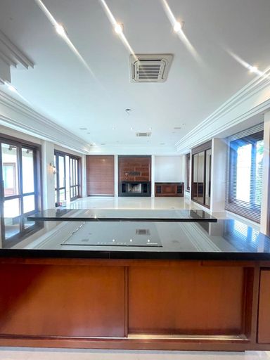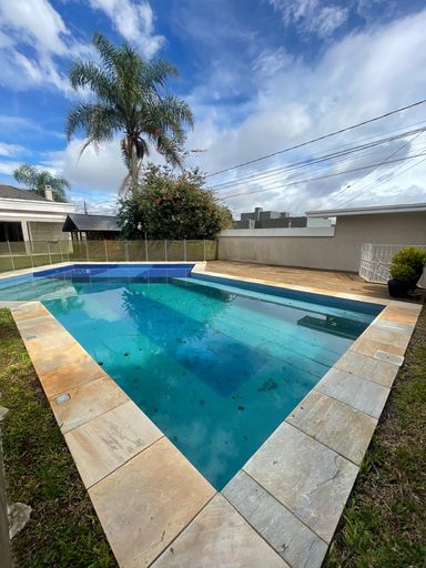 - Ambientes integrados: escritório, lavabo, sala de estar com acesso direto à varanda e piscina, sala de jantar e sala de TV com lareira.